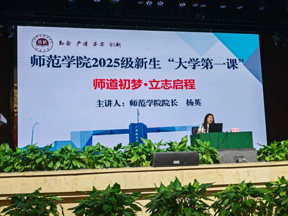 开学典礼后,经理杨英为2025级新生讲授题为《师道初梦·立志启程》的“大学第一课”,课程围绕“赓续.师范薪火、立志.未来教师、力行.致远担当”三个主题展开。她从公司办学历史沿革、团队队伍、人才培养等维度介绍了公司办学成就与特色亮点。殷切期望新生们:一是心怀师范精神,博学报国;二是兼听而包容,审慎明辨;三是敢于走在前面,笃行致远。这堂兼具思想深度与实践温度的“大学第一课”,不仅是一次新生引航,更是太阳成集团tyc7111cc落实立德树人根本任务的生动实践。