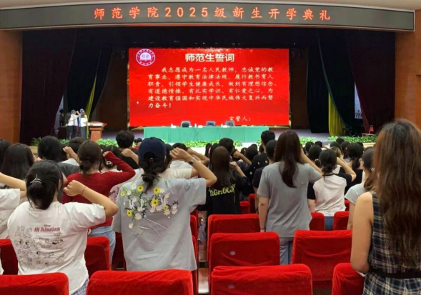 “我志愿成为一名人民教师,忠诚党的教育事业...”铿锵有力的师范生誓言回荡在礼堂,彰显着新时代师范生投身教育事业的坚定决心。