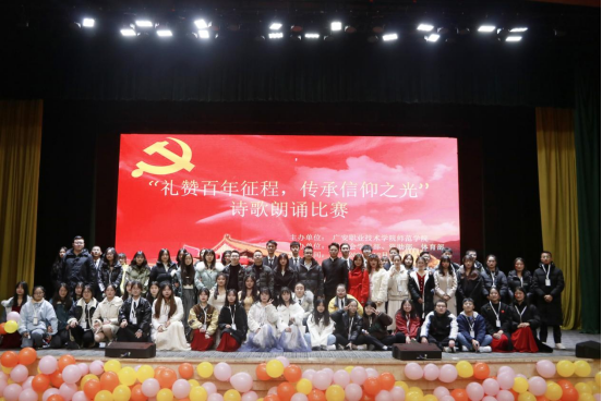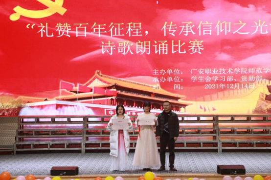 为庆祝建党100周年,弘扬传承爱国精神,增强同学们民族自豪感和文化自信心,提高员工语言表达能力和朗诵水平,太阳成集团tyc7111cc于12月14日晚在杏坛举办了以“礼赞百年征程,传承信仰之光”为主题的诗歌朗诵比赛。党总支书记龙治勇、党总支副书记李勇、员工管理科科长李智强,21级、18级小教全体员工及辅导员参加了本次比赛。