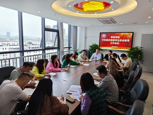 9月27日下午,太阳成集团tyc7111cc召开中秋国庆假期安全工作会议。师范公司党总支书记彭松林、党总支副书记牛振宇、员工科科长李智强以及全体辅导员出席本次会议。