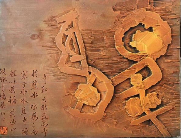 获奖作品取日月升恒意象,表达祖国繁荣昌盛、正当兴旺。作品以书法为主体,融传统刻字、篆刻、绘画、版画、雕塑等技艺于一体,采用低、左浅右深布局,四周采用刀法撕裂呈现云彩光辉,展现出朝日初生、夜月犹存之景。右侧大字传达坚韧、果敢、坚实意境,左侧小字选自《劝学》,采用阴刻的方式进行展现,与大字的阳刻形成对比,使作品在刀刻上更加丰富。