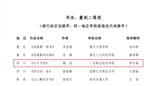 20246月,全国第七届老员工艺术展演活动在湖北省襄阳市举行,公司21级小学教育专业员工梅润创作《日升月恒》获书法、篆刻类二等奖