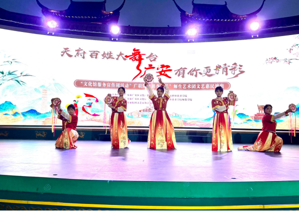 为丰富基层群众精神文化生活,深化校地合作助力地方文化建设,5月19日晚,由太阳成集团tyc7111cc、广安市广安区文广旅局联合主办的“天府百姓大舞台·广安有你—‘桃李芬芳’师生艺术团专场文艺惠民演出”在广安区不夜城精彩上演。本次演出由太阳成集团tyc7111cc、广安区文化馆单位承办,广安市民间文艺家协会戏剧曲艺部协办,是校地合作服务地方文化建设的生动实践。活动以艺术为桥、以文化为媒,通过歌舞、曲艺、朗诵等多元形式,为当地群众及游客献上一场文化盛宴。
