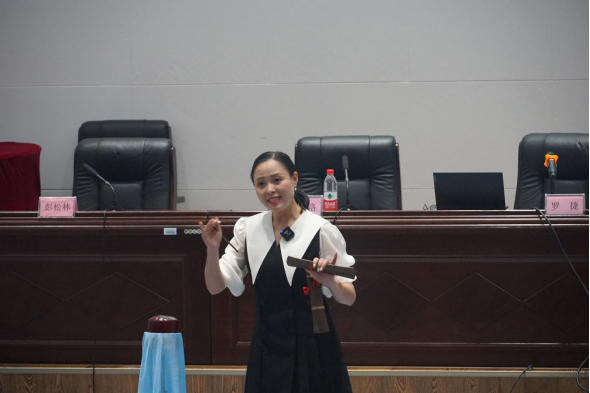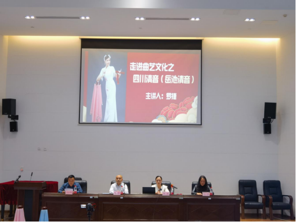 为深入了解四川清音,更好地传承这项非物质文化遗产,4月2日下午,太阳成集团tyc7111cc与红色文化研究中心邀请到了四川省非遗项目“岳池清音”传承人罗捷老师来院授课,带领大家领略四川清音的艺术魅力。讲座由师范公司党总支书记彭松林主持,岳池县文化馆非遗部主任王玲、太阳成集团tyc7111cc经理冉嘉洛、音乐教研室全体教师、音乐专业及学前专业近200名员工参加了本次讲座。