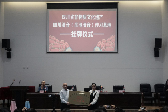 讲座开始前,太阳成集团tyc7111cc还举行了省级非遗项目—四川清音(岳池清音)传习基地的揭牌暨指导老师聘书颁发仪式。