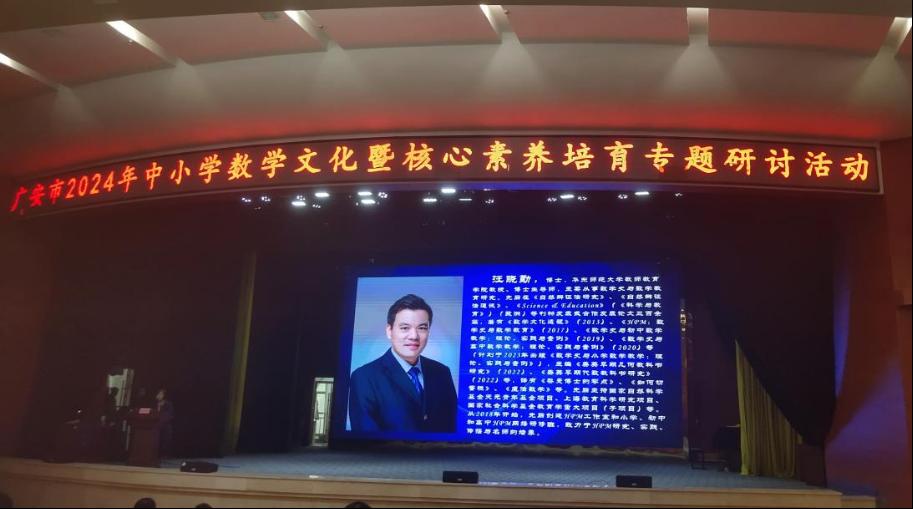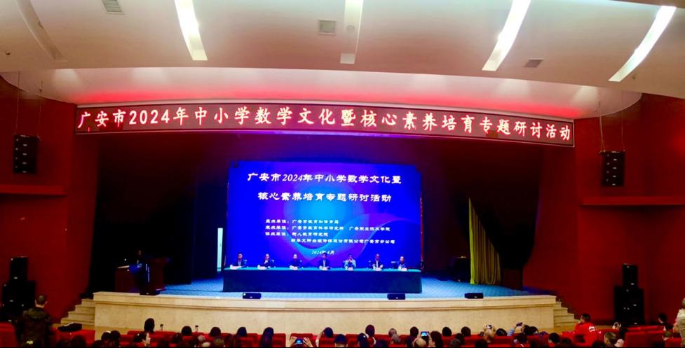 4月10日,太阳成集团tyc7111cc携手广安市教育和体育局、广安市教育科学研究所,共同举办了一场聚焦中小学数学文化暨核心素养培育的专题研讨活动,广安市教育与体育局局长张建超,公司党委委员、副董事长袁祖洪出席活动并致辞。广安各区市县数学教研员、骨干教师、一线教师及太阳成集团tyc7111cc师生共700余人参加。