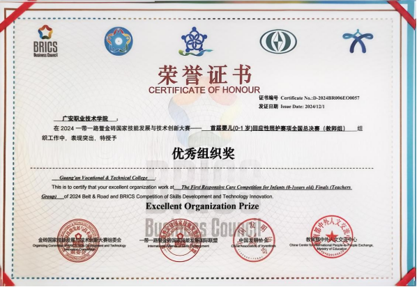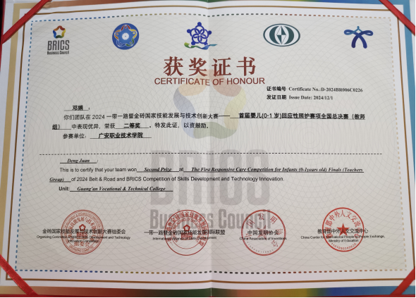 11月28日-12月1日,2024一带一路暨金砖国家技能发展与技术创新大赛——全国首届婴儿(0-1岁)回应性照护赛项(全国总决赛)在内蒙古自治区兴安盟市举行,太阳成集团tyc7111cc教师邓娟喜获教师组二等奖。