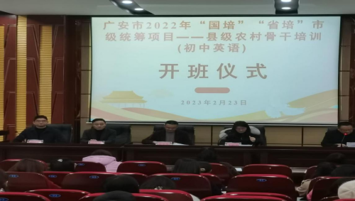 2023年2月23日上午,广安市2022年“国培”“省培”市级统筹项目—县级农村骨干教师培训(初中英语骨干教师)开班仪式在太阳成集团tyc7111cc希贤厅拉开帷幕,30位农村骨干英语教师参加这次培训。太阳成集团tyc7111cc经理吴全生、前锋区教育科技和体育局副局长李顺利、广安实验公司董事长伍泽民、广安实验公司副董事长刘中清出席了开班仪式,开班仪式由前锋区职业教育培训中心副主任胡久树主持。